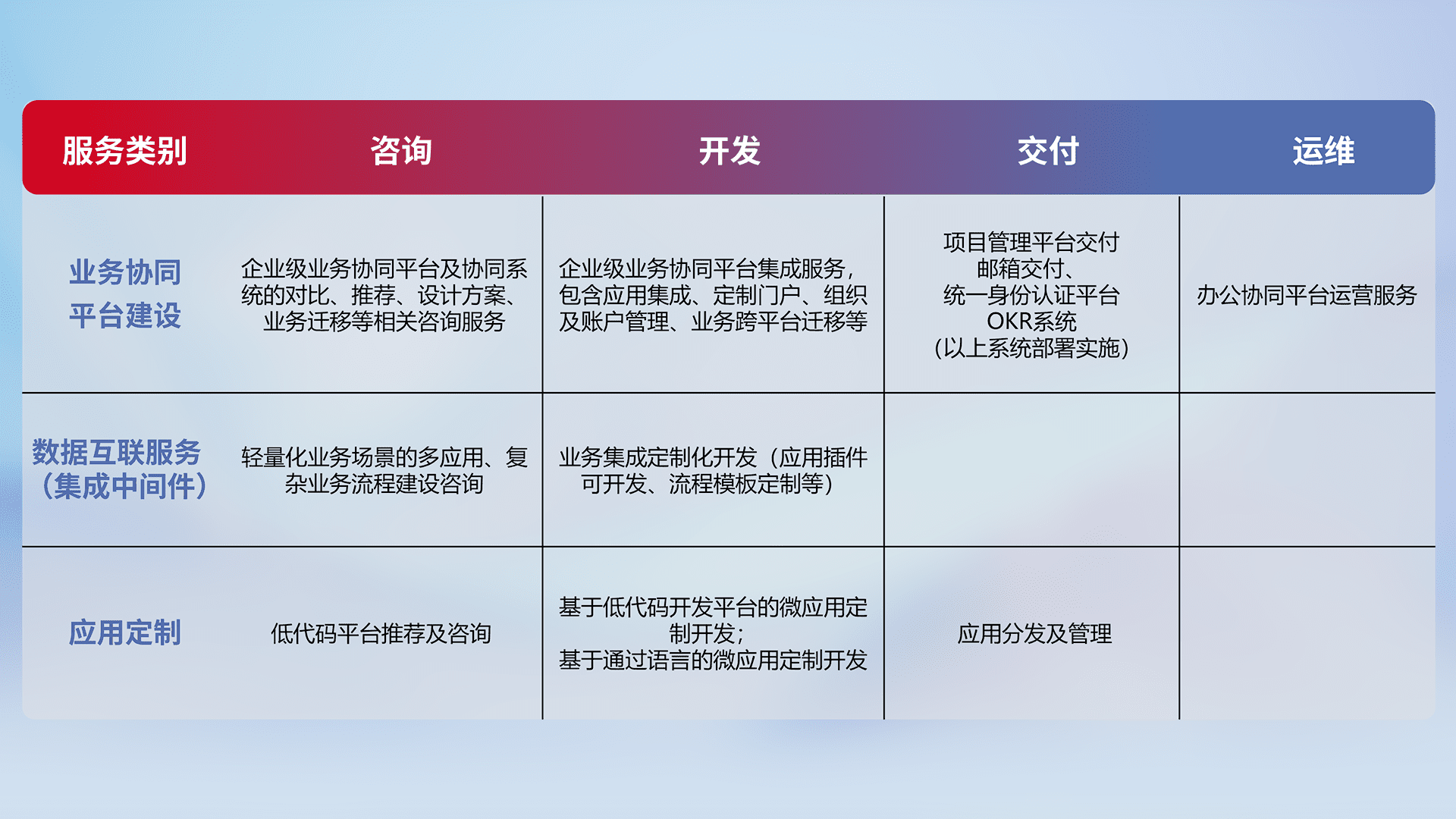 针对钉钉、、企微、、、、IDaas等平台级产品提供产品的规划、、方案、、、、交付、、定制化开发等服务,,,实现如统一协同办公、、、、智能客户服务、、混合会议管理、、智能数据查询、、、、等业务场景,,,实现数字化转型。。。
